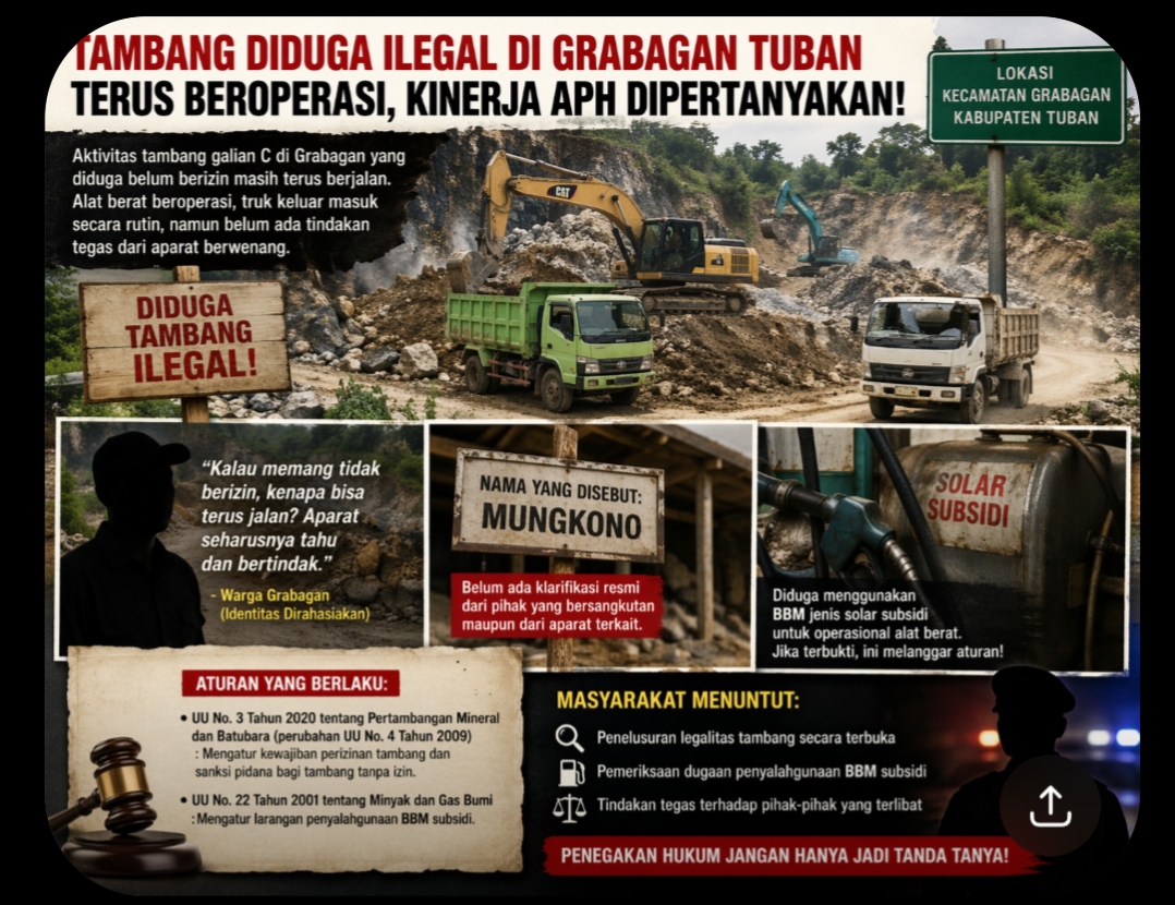 TUBAN – Aktivitas tambang galian C di wilayah Kecamatan Grabagan, Kabupaten Tuban, yang diduga belum mengantongi izin resmi, hingga kini masih terus beroperasi tanpa hambatan berarti. Kondisi ini memicu sorotan publik sekaligus mempertanyakan keseriusan aparat penegak hukum (APH) dalam menjalankan fungsi pengawasan dan penindakan.